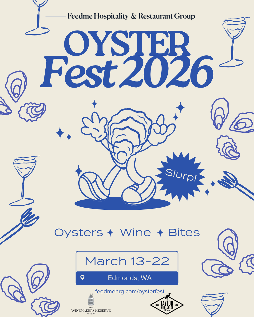 In collaboration with Taylor Shellfish, Feedme Hospitality is thrilled to bring you our FIFTH Annual Oyster Fest! Join us for a 10-day celebration of delectable oysters on the half-shell and specially crafted oyster-themed dishes, perfectly paired with our Winemakers Reserve Sauvignon Blanc.